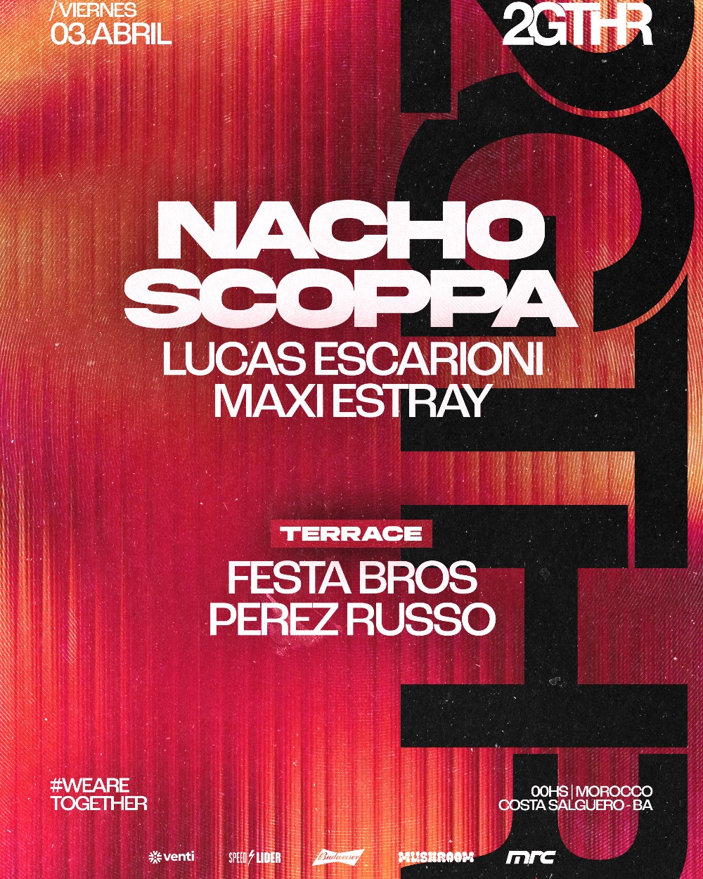 2GTHR presenta: NACHO SCOPPA Viernes 03 Abril 2026 23:59hs a 07:00hs. Apertura 23:59Hs. Cierre de puertas 03:30Hs Mujer +20 , Hombres +21